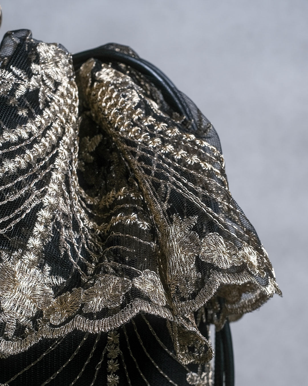 上品な刺繍レースと存在感のあるタッセルがアクセントとなり、コーディネートに華やかさを添えてくれます。